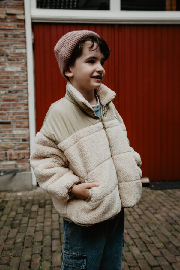 Cremekleurige trui met bruin gemĂȘleerde knopen.